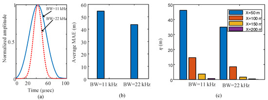 Next, the performance of the sensing system as a function of the bandwidth of the sensing signal is investigated. Two sensing signals with 11 kHz and 22 kHz bandwidths are considered as indicated in Figure 6a. The average MAE and value of with a prediction error greater than X m are illustrated in Figure 6b,c, respectively. In Figure 6b, we see that the higher sensing signal bandwidth has reduced the average MAE by 10.7 m. Similarly, the results in Figure 6c show improvement in the sensing system performance when the sensing signal has larger bandwidth. The value of with a position prediction error larger than 50 m, 100 m, 150 m, and 200 m has been reduced by 11.2%, 5.9%, 2.2%, and 0.4%, respectively. This improvement can be explained by observing the time duration of the captured sensed signals. Every 250 m, there is an event defined for training the model. If the pulses of the sensed signal (see Figure 6a) have a wide duration (i.e., small bandwidth), the regressor faces difficulty distinguishing between the location of two adjacent events owing to their high correlation. Using shorter pulses (i.e., large bandwidth) will de-correlate the training realizations leading to better learning.