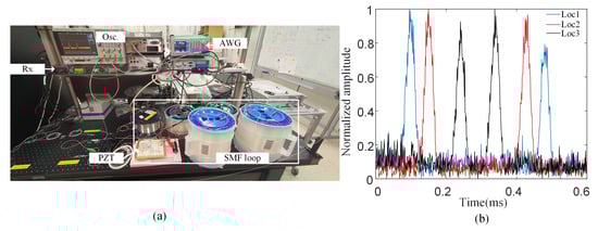 To prove the validity of the proposed model developed using the simulator, an experiment was conducted to generate multiple sensed signals as indicated in Figure 8a. An Agilent LD (Agilent, N7714A) emitting 10 dBm power at 1550 nm was used as the light source. Multiple SMF spans with different lengths that were available in the laboratory were used to build the loop. The entire loop’s length is 106.245 km. A PZT (APC International, 42-1051) device was used to emulate the intruder signal. A Gaussian electrical pulse was generated using an arbitrary waveform generator (PeakTeck, AWG 4125) with amplitude 2.4 Vp-p and 11 kHz bandwidth and applied to drive the PZT in order to emulate the event. A block of soundproof foam was used to keep the PZT from having an effect on the whole sensing fiber. A 10 m length of the SMF was wrapped around the PZT. A polarization controller was used in the loop to manipulate the polarization effect. The PZT was placed at three different locations in the loop: Loc1 = 14.190 km, Loc2 = 24.837 km, and Loc3 = 43.345 km. These locations were measured using an OTDR device. A photoreceiver (Optilab, LR-12.5GR) was used to receive the optical signal, and its output signal was sampled using an oscilloscope (Keysight, DSO-X 3034A) with 1 MSa/s sampling speed. The sampled signal was applied to the developed model input to predict the event location.