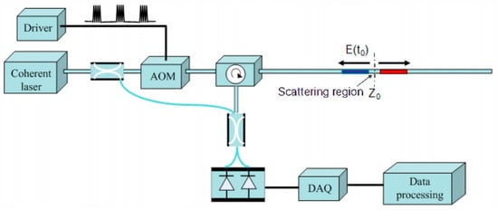 Since Rayleigh scattering is an elastic scattering method without any nonlinear effect, and as the Rayleigh scattered light at different positions can be distinguished via the time of reflection back to the fiber launch end, the optical fiber phase extraction technique based on phase-sensitive optical time domain reflection (φ-OTDR) is widely used in DAS systems [,]. In 2011, using heterodyne coherent detection technology, the phase of the Rayleigh scattering signal was successfully demodulated for the first time []. The scheme of the heterodyne coherent detection is shown in Figure 2. The local oscillator light and the Rayleigh scattering signal at point A can be expressed as: