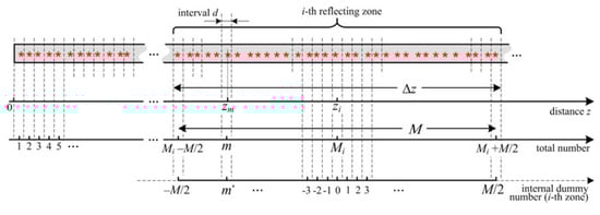 The Rayleigh scattering model is shown in Figure 4. First, the SMF is discretized and the nonuniform distribution of impurities in the core is regarded as a series of equivalent Rayleigh scattering points (ERSP) of micron or submicron size, which are numbered as 1, 2, 3, , M, respectively. Each backscattering coefficient and the position of the scattering point can be presented as ; that is, the M-th scattering point is on , while the reflectivity is . Since the ERSP can be regarded as the superposition of multiple scattering points with a smaller scale, its position can be expressed as , where ∆d obeys the uniform distribution in and obeys the Rayleigh distribution. According to the above analysis, the Rayleigh scattering signal received at the i-th time can be expressed as the superposition of interference of the Rayleigh scattering signal of a section of fiber: