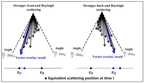 where is the refractive index of the fiber, and zi2 are related to the pulse width, which satisfies , is the pulse width of the probe pulse, and is the speed of light in vacuum. Researchers have also verified this model []; when the interference signal involves interference cancellation, the signal intensity will become weaker, leading to a worse optical SNR. Further, the light intensity declines to the same level as the acquisition noise and the demodulated phase information will be submerged in the noise, forming a blind detection area, which is called interference fading. In addition, due to the randomness of the reflectivity of the equivalent scattering point, the equivalent positions of the signals received at different times are different. The signal received at time i in Equation (5) is taken as an example. Since the scattered signal at this time is the superposition of multiple complex numbers, its intensity is the mode of the complex number, and the phase related to position is the argument for the complex number, so Equation (5) can be expressed as the superposition of multiple vectors. As depicted in Figure 4, when the Rayleigh scattering intensity of the front-end equivalent scattering point is strong, the signal received at time i can be regarded as Rayleigh scattering near the position, while when the Rayleigh scattering intensity of the back-end equivalent scattering point is strong, the signal received at the same time can be regarded as Rayleigh scattering near the position.