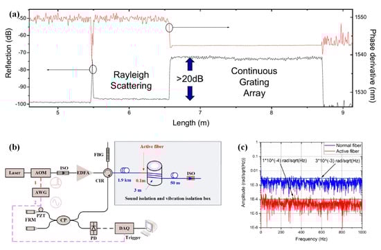 In 2017, the OFS laboratory in the United States used the phase mask method to efficiently and continuously inscribe Bragg gratings in multicore fibers through ultraviolet (UV) exposure. The backscattering intensity of the fiber was increased by 14 dB, and the reflection spectrum is shown in Figure 5a. Then, in cooperation with Fotech in the UK, CSE fiber was used in a DAS system, and the SNR of 1 km of CSE fiber was increased by 15 dB [,,,]. Although this method effectively improves the SNR, the bandwidth of the Bragg grating reflection spectrum is narrow, and the reflection wavelength will drift with temperature and stress variation. When the external environment changes, the wavelength of the incident light and grating reflection may not correspond to each other, resulting in the loss of the scattering enhancement effect. Therefore, the application range of this kind of fiber is limited and cannot be used in fields where high temperature and high pressure are required on site. In addition to inscribing continuous gratings, changing the fiber doping is another way to increase the intensity of the Rayleigh scattering. In 2018, Butov et al. used nitrogen-doped fiber as the sensing fiber, which increased the SNR of the acoustic wave detection by 3 dB []. In the same year, Feng S et al. used an erbium-doped optical fiber for distributed optical fiber sensing, adopted a phase-generated carrier (PGC) optical scheme, which converts homodyne interference into heterodyne interference by modulating the frequency of the signal, decreased the phase noise by 14 dB, and achieved a high-SNR acoustic measurement on 1.9 km optical fiber [].