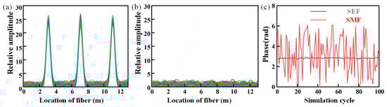 To verify its effectiveness, we have theoretically analyzed the DSE model and the SMF scattering model. According to the parameters shown in Table 1, three SEPs are set at 3, 7, and 11 m on the fiber at intervals of 4 m. Figure 7a,b shows the distribution results of the scattering intensity obtained from the simulation. It can be seen that the DES fiber completely suppresses the random variation of the signal amplitude and interference fading. To further explore the suppression effect of the DSE fiber on the phase noise, we solve the phase differences between 3 and 7 m on the SMF and DSE fibers, respectively, the of which results are shown in Figure 7c. Compared with SMF, the DSE fiber is not affected by the random distribution of ordinary ERSPs, but is determined by the position of the SEPs, so the phase noise is greatly suppressed.