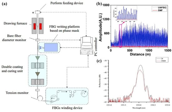 Typical UWFBG preparation method: (a) online UWFBG preparation system []; (b) OTDR measurement results of the UWFBG array []; (c) reflection spectrum of UWFBG [].
