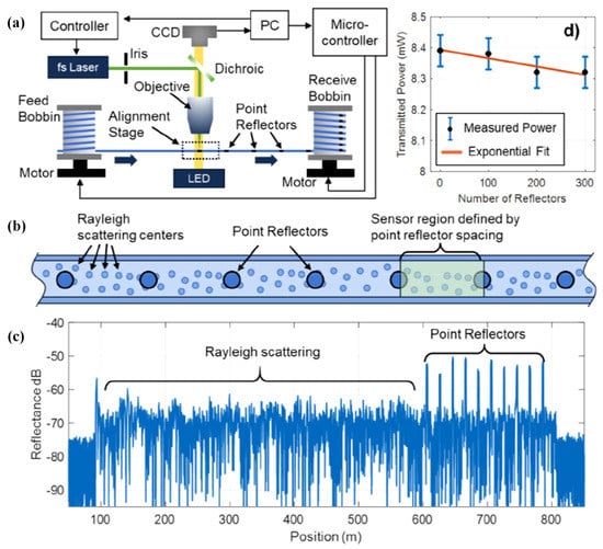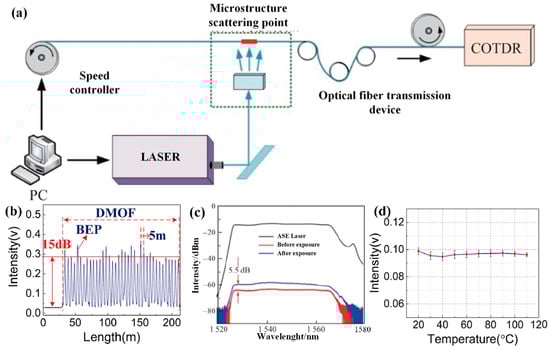 In recent years, the enhancement scheme of a local achromatic weak reflection array has also been used in DAS [,]. In order to prepare a more universal discrete scattering enhancement array, Sun et al. proposed a preparation method for microstructured optical fibers with a colorless reflection point. The mechanism of the microstructure involves the local refractive index change through UV exposure without the help of the phase mask to form a Fresnel reflecting surface. The fabrication system is shown in Figure 9a [], while the preparation results are shown in Figure 9b–d []. A discrete scattering enhancement array with an interval of 5 m and 15 dB enhanced intensity was achieved. When the temperature changes, the scattering intensity of the microstructure is extremely stable. In addition, the University of Southampton and other universities in the UK also used a femtosecond laser to prepare a weak reflection array []. The preparation system, scheme, and results are shown in Figure 10. Compared with UWFBG, whose reflection bandwidth is limited, the weak reflection points are directly engraved in the optical fiber, without wavelength selectivity, avoiding the influence of temperature and strain [].