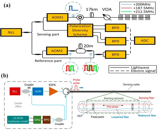 - Zhou, L.; Wang, F.; Wang, X.; Pan, Y.; Sun, Z.; Hua, J.; Zhang, X. Distributed Strain and Vibration Sensing System Based on Phase-Sensitive OTDR. IEEE Photon. Technol. Lett. 2015, 27, 1884–1887. [Google Scholar] [CrossRef]