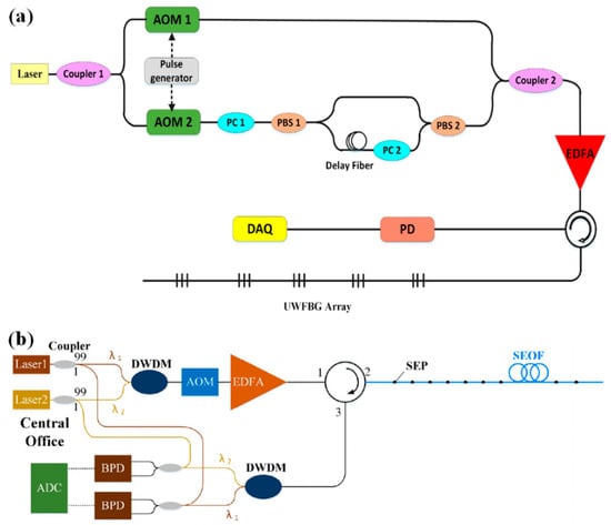 In the early stages, researchers mainly focused on using UWFBG in various DAS schemes. In 2015, Wang et al. used UWFBG in DAS based on a 3 × 3 coupler demodulation for hydroacoustic testing, which can detect a water pressure of 0.112 Pa []. Subsequently, the team at Huazhong University of Science and Technology successively used DSE fiber in various DAS schemes, such as double-pulse, coherent detection, and PGC demodulation schemes [,,,,,,]. These schemes are shown in Figure 11. In recent years, more attention has been paid to improving the DAS system performance by using the advantages of discrete scattering enhancement fiber, including low-frequency phase shift compensation, polarization fading suppression, pulse width compression, and system sampling rate expansion.