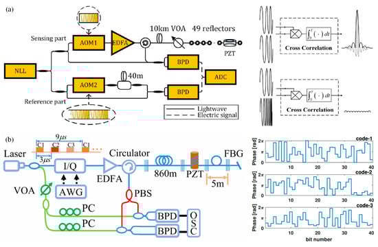 In the DAS system, the interval between the SEPs determines the resolution of the system and also limits the width of the detection pulse. Assuming that the interval between the SEPs is d, the detection pulse is limited to (where n is the refractive index of the fiber and c is the speed of light in the vacuum). In a radar system, a longer detection pulse is usually transmitted and the pulse is compressed at the receiving end, so as to obtain a signal with a high signal-to-noise ratio under the premise of ensuring the resolution. The common schemes are pulse linear frequency sweeping and pulse coding [,,]. These techniques have also been used in DSE fiber DAS systems. Fan et al. adopted the sweeping pulse transmission scheme, whereby the receiving end compresses the pulses through matched filtering, achieving a noise level of at 500–2500 Hz as shown in Figure 14a [,]. Wang et al. successively used pulse coding technology in UWFBG-based DAS systems and improved the systems’ SNR values by 6.9 dB as shown in Figure 14b [].