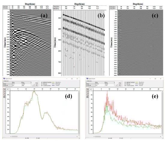 VSP test results for the microstructure fiber DAS system []: (a) “zero bias” test results; (b) schematic diagram of signal consistency; (c) “non-zero bias” test results; (d) “zero bias” spectrum diagram; (e) “non-zero bias” spectrum.