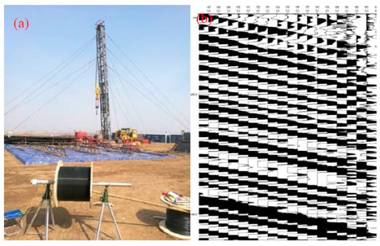 Sun et al. conducted a walkaway VSP experiment using a self-made microstructure fiber DAS system []. The microstructure fiber is arranged vertically in the test well and the explosive source is artificially introduced on the ground to generate seismic waves, which are transmitted along the stratum to generate direct waves and reflected waves. Figure 16 shows the VSP results recorded at the “zero bias” position and 2.5 km away from the “non-zero bias” position. Figure 16a is the seismic wave transmission diagram recorded by the microstructure fiber DAS system under the condition of “zero bias”. The specific details are enlarged, as shown in Figure 16b. It can be observed that clear direct transmission of the p-wave and s-wave is demonstrated, and that the peaks and troughs of multi-channel signals correspond to each other, highlighting the phase difference caused by the transmission time, which proves the high consistency of the microstructure fiber DAS system. In addition, as shown in Figure 16c, for the “non-zero biased” signal away from 2.5 km, the microstructure fiber DAS can also record direct waves and reflected waves with high SNR values. The DAS system based on microstructure fiber has the advantages of a high SNR, high signal consistency, and high reliability, meaning it could become an efficient, fast, and reliable acquisition tool for oil data acquisition, potentially allowing intelligent resource exploration.