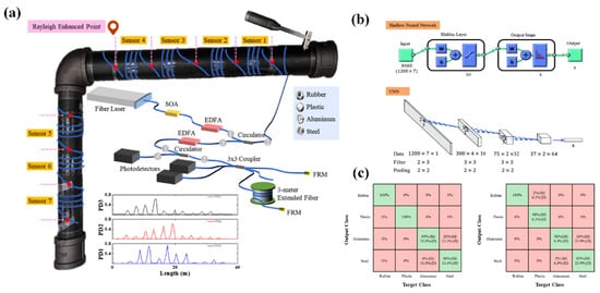 Schematic diagram of a pipeline survey []: (a) schematic diagram of DAS system for pipeline protection; (b) architectures of neural networks in the pipeline protection system; (c) the confusion matrix of four acoustic events.