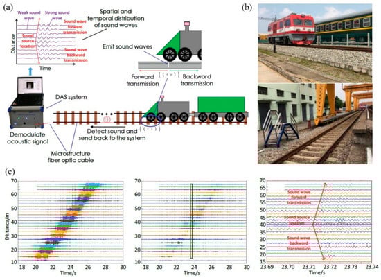 With the development of high-speed railway technology, track defect monitoring has become more important. A variety of mature detection methods have been developed, but most of them involve electromagnetic sensors, which are vulnerable to harsh environments []. In 2019, Sun et al. used a DAS system based on scattering-enhanced fibers for distributed detection of a railway defect []. As shown in Figure 19, the scattering-enhanced fiber is set in the middle of the rail. At the position where the defect occurs, the interaction between the wheel and rail will form an impact sound signal, which is transmitted along the two directions of the track. The DAS system is used to track the transmission signal, and then the accurate positioning of the defect is identified through the positioning algorithm, the results of which show that the maximum error of the defect is only 2.1 m. This method can provide an effective and reliable solution for rail health monitoring.