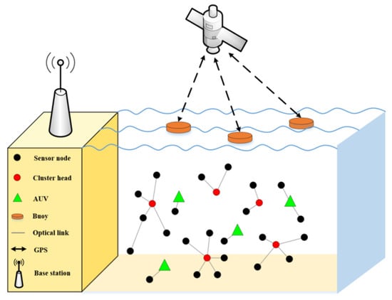 Due to the short transmission distance of UWOC, AUVs with cruise function can be adopted to assist data transmission [35]. These AUVs are equipped with acoustic–optical hybrid systems, which can be switched between optical signals and acoustic systems to adapt to different communication ranges [44]. They establish communication links directly with sea buoys. The buoys obtain their own position information through GPS positioning, and calculate the position of AUVs according to the time difference of AUVs data arrival [45]. When an AUV approaches the network, it can quickly collect the data transmitted by the node and forward it to the corresponding sea buoy. On the other hand, AUVs can also be used as an anchor node for underwater node positioning [17]. Due to sea water turbulence and other reasons, the actual position of the node may deviate from the initial position. AUVs can also periodically update the actual site information of nodes.