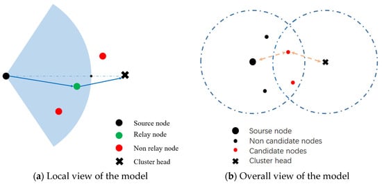 In the above cluster-head selection strategy, the nodes located in the dense region are more likely to be selected as the cluster-head, which may lead to the cluster-head being far away from the area with sparse sensors. Due to the “exponential” characteristics of energy consumption, the node accessing network in this area may consume significant energy, as in Figure 3. Therefore, the proposed algorithm communicates these nodes with the cluster-head through dual-hop transmission, to access the network. The nodes in the sparse region take the nodes in the union region of the transmission range and the cluster-head transmission range as candidate nodes. We choose the node with the minimum dual-hop distance in the region as the relay node, as in Figure 4.The specific steps of dual-hop are as follows: the source node turns on the optical transmitter in the corresponding direction after determining the CH position, and limits the power to just be able to reliably transmit within 50 m.As shown in Figure 4a, the node closest to the intersection of the sector edge and the connection from the source node to the cluster-head are selected as the relay node. In this way, the most energy-saving relay node in the dual-hop candidate area can be selected. Figure 4b shows the model of the dual-hop strategy.