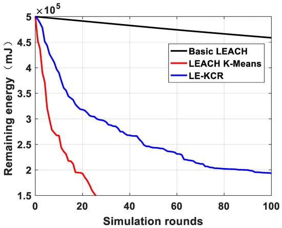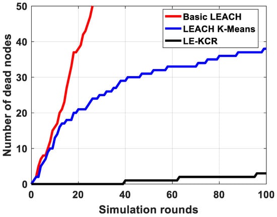 Figure 5 shows the simulation results on dead nodes with different rounds, when the basic LEACH, the LEACH k-means, and the proposed LE-KCR algorithms are adopted. As shown in Figure 5, the LEACH algorithm dies more than half of the nodes in less than 30 rounds. The Leach-k algorithm dies nearly 40% of nodes after running 100 rounds and, in order to ensure the consistency of the comparison, we set the same conditions for the proposed LE-KCR algorithm. Before reaching the energy threshold condition, only 4% of the nodes die by running 100 rounds. In the proposed LE-KCR algorithm, the selected cluster-heads are close to most nodes, so less energy is required for each round. This shows that the proposed algorithm is extraordinarily energy-saving.