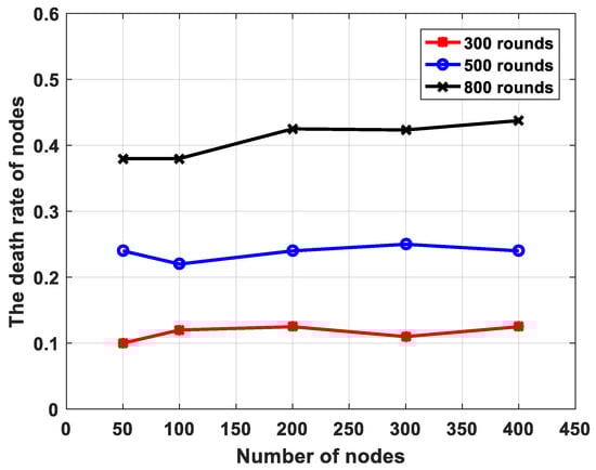 Figure 8 presents the change in the death rate of nodes when the different network sizes are employed. As revealed in Figure 8, the change in network size has little impact on node mortality. We set the number of different nodes and calculate the node mortality after 300, 500, and 800 rounds of simulation. We can see that with the increase in simulation rounds, the node mortality of the network with the same number of nodes will increase significantly. However, with the increase in network scale, after 300, 500, and 800 rounds of network simulation, the node mortality fluctuates up and down at 0.11, 0.25, and 0.4, respectively. Due to the randomness of the nodes’ located site, the network is different in the simulation. Therefore, the statistical mortality rate will fluctuate to a certain extent, but within a reasonable range. This proves that the performance of the proposed LE-KCR will not be greatly affected by the change in network scale.