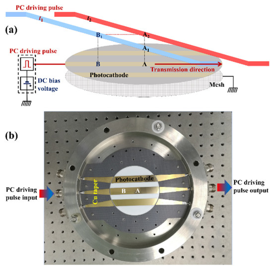 As the driving pulse travels in the PC, the photoelectron emitted points along the PC have varying voltages. For instance, in addition to the negative high DC bias voltage, point A in the PC receives voltage A1 and point B receives voltage B1 at time t1, as shown in Figure 2a. Voltage B1 is larger than voltage A1, which leads to a faster speed for photoelectrons emitted from A than from B. Therefore, the drift time from the mesh to the MCP for the photoelectrons from A is less than that of the photoelectrons from B. Because the MCP has a gate width of TMCP, the drift time difference of the photoelectrons should be less than TMCP to ensure that the photoelectrons are received at the same time. Otherwise, one of the photoelectrons emitted from A and B will be gained, while the other will be absorbed. It is assumed that the PC driving pulse takes time t to be transmitted from B to A, and the drift time difference between photoelectrons from A and B is: