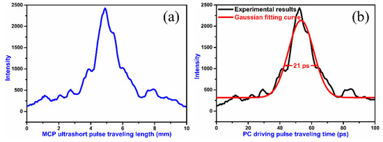 A static image is obtained with a −3 kV static DC bias for the PC and a −700 V bias for the MCP, as shown in Figure 5a. The intensity distribution in Figure 5a is not uniform, which is because of the nonuniform spatial distribution of the X-rays due to the bad laser mode. A gating image with time dilation is shown in Figure 5b, when the PC is given a driving pulse in addition to the −3 kV DC bias and the MCP is given an ultrashort pulse in addition to the −500 V DC bias. To obtain X-ray information with different times, three coaxial cables with equal difference in length are used. The coaxial cable length is increased by a 10 mm step. Then, the three PC driving pulses reach the PCs at different times. The delay time between each pair of adjacent PC driving pulses is about 50 ps. In this experiment, the driving pulse on the middle transmission PC is synchronized with the X-ray pulse, while the other two PCs are unsynchronized. Therefore, a gating image is only obtained in the middle PC. The intensity versus the spatial distribution along the MCP from Figure 5b is shown in Figure 6a. The final results in Figure 6a are calibrated by the static results from Figure 5a. Because of the 2:1 image ratio, the PC area related to the gating image is doubled. The driving pulse travels left to right across the PC at a velocity of approximately 1.87 × 108 m/s. The intensity versus temporal distribution along the PC for the gating image was obtained from the PC driving pulse velocity and the gating image spatial distribution, as shown in Figure 6b. As analyzed in Formula (7), the time resolution can be obtained from the PC streak image. The full width at half maximum (FWHM) of the temporal distribution curve represents the time resolution [5,7,8]. In Figure 6b, the black solid line and the red line represent the experimental results and the Gaussian fitting, respectively. Figure 6b shows that the time resolution of the UXI is 21 ps.