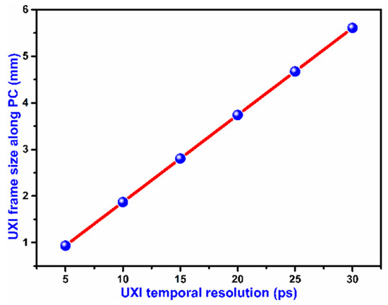 From Figure 5b and Figure 6a, it can also be seen that the frame size of the UXI is 12 mm × 3.9 mm. The PC width determines the frame size perpendicular to the PC of 12 mm. The voltage spatial distribution of the driving pulse reduces the frame size along the PC to 3.9 mm. The voltage spatial distribution causes the electrons emitted from different positions along the PC to have varying drift times from the mesh to the MCP. Because of the time-resolved MCP, electrons with drift time differences less than the MCP gate width can be gained by the MCP to output the signal, while the remaining electrons are absorbed by the MCP. Therefore, the gating image with time dilation is a streak image, as shown in Figure 5b. In the ICF experiment, the object is first enlarged by the Kirkpatrick–Baez (KB) X-ray microscope or the pinhole array and then imaged in the PC [16]. The frame size is an important parameter that is closely related to the spatial resolution and the detectable object size [17]. A larger frame size allows for greater enlargement magnitudes, which improves the spatial resolution. While the enlargement magnitude is fixed, the detectable object size increases with the increasing frame size. Currently, each dimension of the frame size in frequently used X-ray imagers is 6–13 mm [17], and the 3.9 mm frame size along the PC is too small. The relationship between the theoretical UXI frame size along the PC and the time resolution is shown in Figure 7, with the frame size decreasing with improving time resolution.