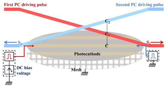 To increase the UXI image size, two opposite-transmission driving pulses should be used to simultaneously excite the PC. Figure 8 shows the schematic diagram for this method. The first driving pulse travels from left to right across the PC, while the second pulse travels from right to left. At a certain time, the voltage at point C in the PC is equal to the voltage at point C1 in the first PC driving pulse plus the voltage at point C2 in the second PC driving pulse. It can be concluded from Figure 8 that the voltage at each point in the PC is consistent. Therefore, electrons emitted from different PC positions have the same drift times from the mesh to the MCP, and the UXI frame size is not limited by the time resolution, which allows for larger frame sizes. It should be noted that when the PC driving pulse was synchronized with the input optical signal, the PC driving pulse starting points S1 and S2 passed through the PC end points in their respective transmission directions.