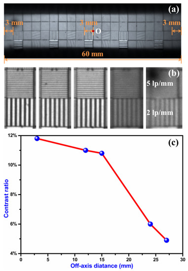 (a) The middle PC image with resolution mask. (b) The enlarged views of the mask with 2 lp/mm and 5 lp/mm in the middle PC image. (c) The relationship between the contrast ratio of 5 lp/mm mask and off-axis distance.