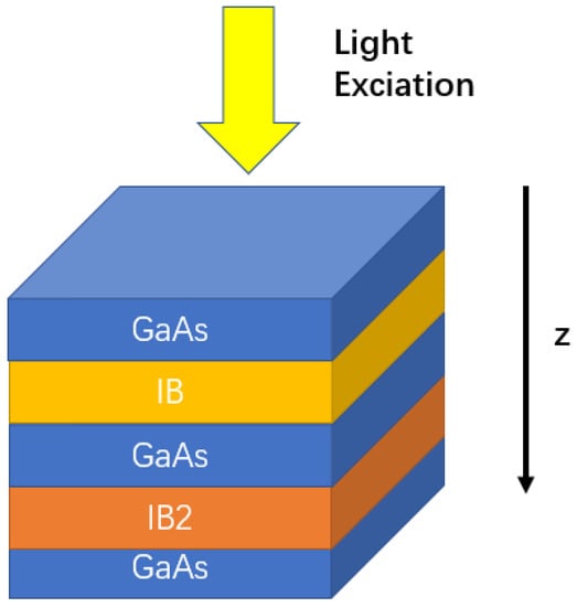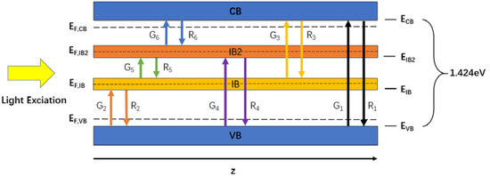 In order to improve the efficiency of solar cells and overcome the Schockley–Queisser limit, researchers have proposed many new theories and technologies. These include the intermediate-band solar cell (IBSC), with a detailed balance-limiting efficiency of 63.2% compared to 40.7% for a single-junction solar cell at full concentration; when compared with tandem cells, the IBSC can not only achieve multispectral absorption, but can also achieve higher efficiency because it is not limited by current matching conditions [1,2,3,4]. Even under one sun, the IBSC can achieve an efficiency of 46.8% instead of 31% for a single-junction solar cell [1,4]. The IBSC achieves ultra-high efficiency because it introduces an additional energy band that lies within the normal bandgap. Therefore, it breaks through the limitation of the traditional bandgap and creates extra photon absorption through the sequential absorption of the two sub-bandgaps, which greatly broadens the absorption of the solar spectrum. The IBSC is regarded as the third generation of solar cells that breaks the limiting efficiency of traditional photovoltaic devices [5,6]. The IBSC, with an efficiency of 63.2%, is inserted at an intermediate level of 0.71 eV below the conduction band into a material with a bandgap of 1.95 eV [7], which means that it is unable to absorb photons below 0.71 eV. However, the number of such photons is considerable, which ultimately makes the IBSC fail to surpass the limiting efficiency of 63.2%. Some researchers also proposed the concept of a photon ratchet IBSC; however, in terms of the photon absorption process, it is still essentially a solar cell with a single intermediate band, and the ratchet band focuses on increasing the lifetime of carriers [4,8].