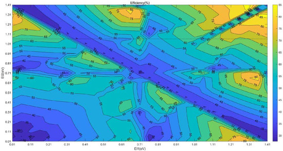 For the reverse diagonal line L (EI2 = 1.42 eV − EI1, connected to the point EI1 = 0.01 eV, EI2 = 1.41 eV, and the point EI1 = 1.41 eV and EI2 = 0.01 eV) in Figure 3, the efficiency is about 35% in L, as well as all the points around it, which are low values in the entire graph. To understand why this is, each of points with small fluctuations near L can be defined as: