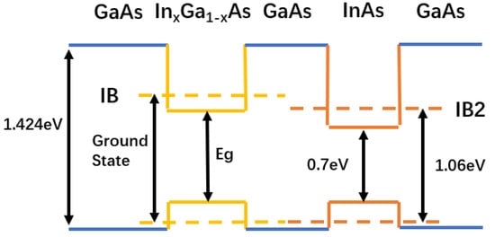 The above calculations are based on GaAs host materials, and all the possibilities are considered when GaAs is inserted into the dual intermediate bands. To achieve IBSC in experiments, the current IBSC uses mainly QDs (QD-IBSC), which always apply the Stranski–Krastanow (SK) growth mode in hetero-epitaxially mismatched systems and then a self-assembled InAs QDs island structure is formed on the GaAs surface due to strain [18]. By combining the previous calculations, it can be shown that the ternary alloy InxGa1−xAs QDs are used as the second intermediate band in the InAs/GaAs QDs system. The bandgap of the normal InAs material is 0.36 eV; however, due to the three-dimensional quantum confinement effect of QDs, the continuous bands show atom-like discrete energy levels (where the ground state is similar to s, and the excited state is similar to p). For an InAs/GaAs QDs system, the energy-level space between the ground-state electrons and holes in InAs QDs is 1.06 eV [21,22], and the bandgap becomes 0.7 eV [17]. If the VB is assumed to be continuous at both the QDs and the GaAs, the ground state in the InAs QDs valence band will be aligned with the GaAs valence band edge (∆EV = 0) [13,23]. In this way, the ground state in the CB of InAs QDs can be approximated as the first intermediate band, that is, the position 1.06 eV above the VB of the entire device. The same treatment can be performed for InxGa1−xAs QDs as the second intermediate band, the band diagram of which is shown in Figure 4. The density of the QDs is high enough to improve absorption coefficient, the carriers’ transfer is perfect, and the QDs have no defects. Combined with our calculation, the analyzation can be performed.