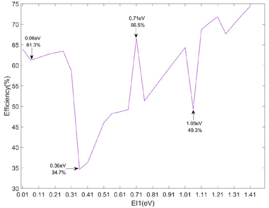 In Figure 3, in the case of EI2 = 1.06 eV, we extract the efficiency of all points from 0.01 eV to 1.41 eV for EI1, as shown in Figure 5 (all the points on the black dotted line in Figure 3).