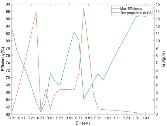 Next, EI1 is changed from 0.01 eV to 1.41 eV for a specific EI1, and the point is drawn that maximizes the efficiency in a series of EI2 (EI1 and EI2 are symmetrical in Figure 3, and changing EI2 is also permitted). These conditions allow for the process of dividing G5 by the total number of absorption photons g (not the net photons Ntotal), as shown in Figure 6.