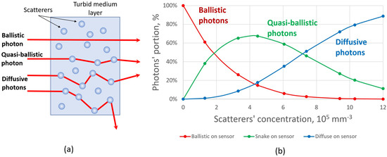 Figure 2. (a) Schematic trajectories of photons propagating through a scattering medium: ballistic, quasi-ballistic, and diffusive photons. (b) Number of photons reaching the sensor for the scatterers’ concentration range from 105 to 106 mm−3 (numerical simulation results).