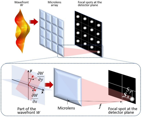 Shack-Hartmann principle consists in dividing the wavefront into a large number of small sub-apertures using a microlens array and measuring the displacements of focal spots in the detector plane. The spot displacement is proportional to the slope of the wavefront at the microlens aperture (Figure 3). Thus, by measuring the spot displacements and calculating the values of the derivatives of the polynomials used (Zernike, B-spline [38], etc.—in this paper we used Zernike), we can calculate the coefficients of the polynomials, which then can be used to approximate the wavefront.