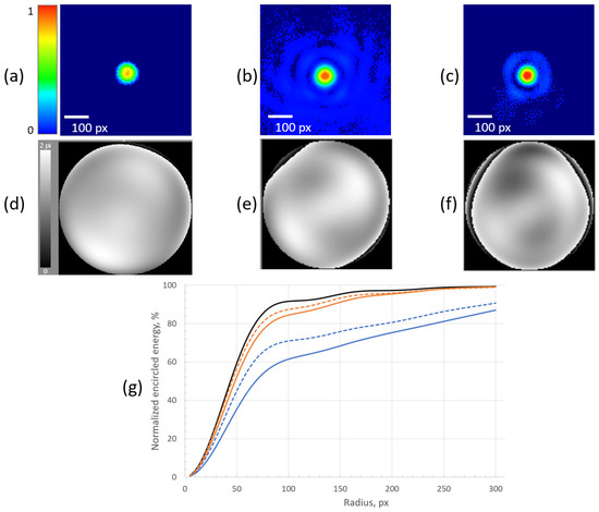 Figure 7. (a) Intensity distribution of the far-field focal spot obtained after the calibration procedure was done (glass cuvette contained water only). (b,c) Intensity distributions after optimization by means of the SLM for the concentration values 3.1 × 105 mm−3 and 8.2 × 105 mm−3, correspondingly. (df) SLM patterns that were used to obtain intensity distributions of focal spots presented above. (g) Normalized encircled energy charts: black solid curve—without scattering medium; blue curves—with scattering medium with concentration value 3.1 × 105 mm−3 before (solid curve) and after (dashed curve) focusing with the SLM; orange curves—with scattering medium with concentration value 8.2 × 105 mm−3 before (solid curve) and after (dashed curve) focusing with the SLM.