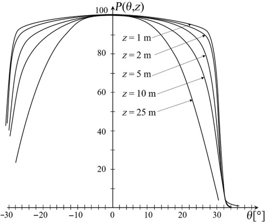 where P(θ,z) is the angular power distribution at fiber length z, θ is the propagation angle with respect to the core axis, D is the assumed constant coupling coefficient [4,12,13,14], and α(θ) is the modal attenuation. Since only relative modal power distribution is of interest, α(θ) may be removed from the Equation (1), therefore Equation (1) reduces to: