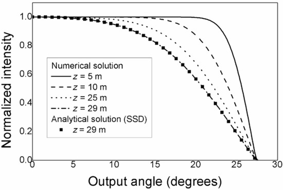 Normalized P(θ,z) along the CROFON fiber numerically calculated for Gaussian launch distribution centered at θ0 = 0° with (FWHM)z=0 = 58°, at z = 5, 25 and 29 m (⯀ represent the analytical SSD, Equation (3)).