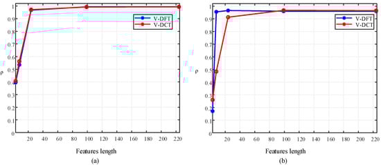 The V-DFT and V-DCT features represent the IQH in a more compact form. As discussed in Section 3.1, the optimal value of parameter K, which provides the best monitoring accuracy, needs to be selected. Towards that objective, the monitoring accuracy is evaluated at different values of K, including K = 2, 3, 5, 10, 15, which correspond to V-DFT and V-DCT features vectors of lengths 3, 5, 24, 99, 224, respectively. Figure 11 shows the monitoring results of V-DFT and V-DCT features versus the length of features vector. The results show that the monitoring accuracy almost remains unchanged as the value of K is equal to or greater than 10. Therefore, the V-DFT and V-DCT features with length ( = 99) are used in the rest of this work.