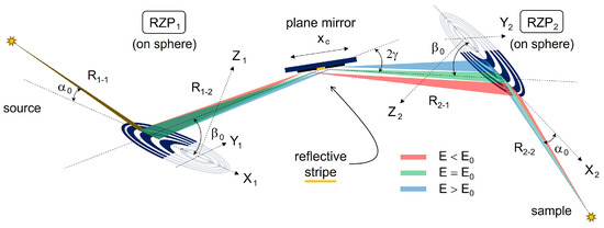 - Both RZPs are designed as “hybrid” RZPs [26,27,28] for meridional (1-D) focusing and sagittal collimation (exactly at the design energy and approximately offside), to relax the grating line density, enabling an enlarged angular acceptance and photon flux.
