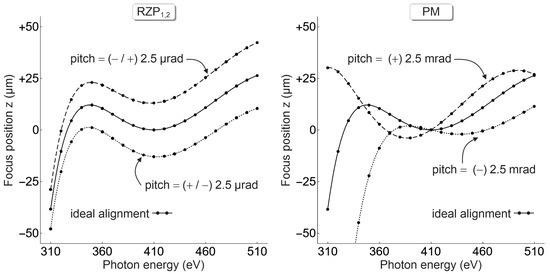 In practice, the performance might suffer from misaligned optics. Among all translational and angular degrees of freedom, the critical pitch angles of the RZPs (rotation around axis ) and the PM are considered exemplarily. Figure 2 illustrates the effect of tilted substrates, evaluated in terms of the vertical focus position z as a function of the photon energy E.