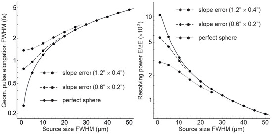 In the presence of surface imperfections on the arcsec scale and the inevitable Fourier limit from Equation (3) for a pulse of finite bandwidth such as, e.g., in Table 1, a source size in the order of ∼ would be required to reach the sub-fs regime. Beyond , the influence of slope errors on is more and more insignificant.