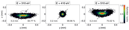 Normalized intensity distribution, obtained by Monte Carlo RT, for three photon energies in the sample plane (Figure 1), assuming a source size (FWHM). The relative flux inside the dashed circle with a diameter is noted in the lower-right corner of each picture.
