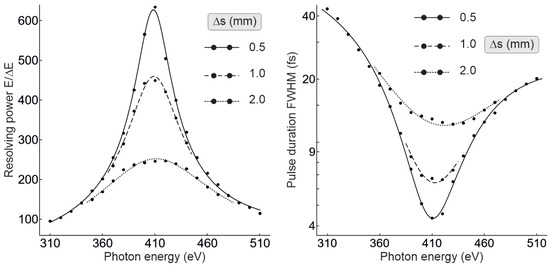 Spectral resolving power (left) and pulse duration (right) of the TDCM as a function of the photon energy at three values for the reflective stripe width , in each case for a source size of (FWHM). Ray-tracing data (dots) follow the nonlinear fit model (solid, dashed and dotted lines) from Equation (5). Toward off-design energies, the curves coincide asymptotically, with reduced plots for clarity.