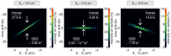 Pulse dimension in the energy-time domain and type (up or down) of the residual chirp are characterized by temporal FWHM and sign of the GDD, respectively. The nonlinear group delay from Equation (6) overcompensates the chirp at , whereas the compensation is incomplete at . Nonetheless, the compression ratio —defined as the pulse length (FWHM, see Figure 7) of the source divided by that on the sample—is significantly larger than one over the whole interval of . As evaluated from a detailed scan in steps , the function peaks at with (including statistical uncertainties) and declines continuously toward off-design energies, like the resolving power in Figure 6, for instance. Within a range of around , at least of that maximal compression is achieved (FWHM), confirming the broadband capabilities of the instrument again. In proportion to , the intensity of the pulse increases too—and could be many times higher than that of the input signal, in principle. However, in contrast to visual optics, absorption and diffractive loss (Section 4) diminish the gain notably, and the peak intensity on the sample varies between at over near to about at , as shown in Figure 7.