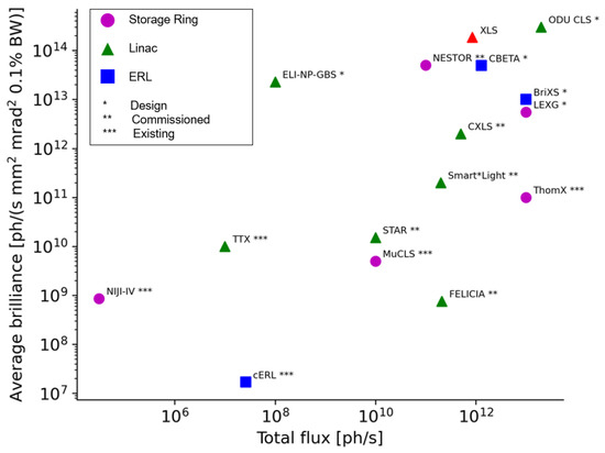 Three main types of ICS sources have been proposed: storage-rings-based (SR), linac-based, and energy-recovery-linac-based (ERL). The first are the most common; notable examples include MuCLS and ThomX. Due to beam recirculation, storage rings can reach high values for flux; however, quantum excitation in the bending magnets limits the minimum emittance, hampering the ICS performance. Linacs have also been considered for compact ICS designs; for instance, TTX in China, BoCXS in Bologna [9], and STAR in Consenza, Italy [10]. Compared to storage rings, linacs feature limited repetition frequency; this is compensated by the lower electron beam emittance and shorter bunches, which are both critical parameters in X-ray production. More recently, energy recovery linacs garnered interest and ERL designs for ICS have been published [11]. However, ERLs require superconducting technology, which is costly and not easily available to hospitals or small laboratories. A summary of flux and brilliance values for various ICS sources is included in Figure 1.