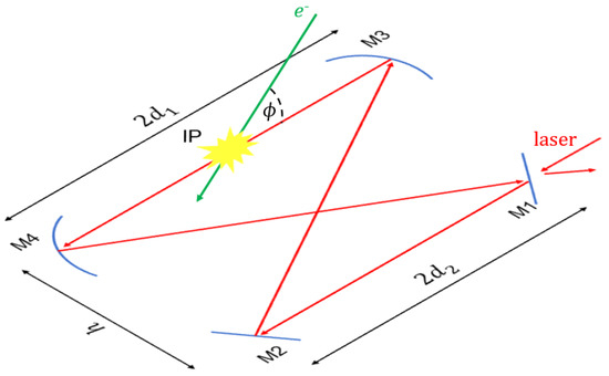 To obtain a large pulse energy and maximise flux, TRUMPF’s 1 kW Dira 1000 [36] was considered. The Dira 1000 is a state-of-the-art, high-power compact laser with a pulse length of and a wavelength of 1 . To ensure cavity stability and achieve a micrometer-size beam waist at the interaction point, a four-mirror bow-tie FPC was considered [33,37]. The cavity geometry and laser spot sizes required to maximise flux were obtained using the method described in [34]. A sketch of the FPC cavity, including the electron beam and the interaction point, is shown in Figure 4.