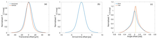 Laser offset scans of normalised flux in a 1.5 cone of the XLS-based source. (a) Scan of transverse offsets, horizontal and vertical. (b) Scan of longitudinal offset, expressed in terms of the arrival time. (c) Scan of angle offsets, pitch and yaw. The offset corresponding to the 2 crossing angle was marked with a dashed line.