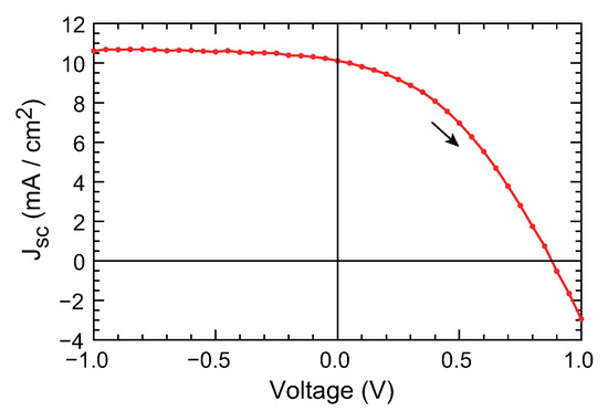 Figure 2 shows the J-V characteristics of the sample cell at the time of the LTEM measurements in a solar simulator. The filled red circles show a two terminal voltage sweep from −1 V to 1 V, and the waiting time at each measurement point indicated by the circles is 400 ms. The filled red circles show a two-terminal voltage sweep from −1 V to 1 V. The J–V curve shows a J of 10.1 mA/cm2 of 0.88 V, and an energy conversion efficiency of 3.5%. The current did not significantly leak when this sample was reverse biased. Therefore, the sample is suitable for the measurement using LTEM in which light pulses irradiate the sample while reverse bias is applied. In the LTEM measurement, large reverse bias was applied, risking damage to the sample, but significant breakdown was not observed until applying −14 V.