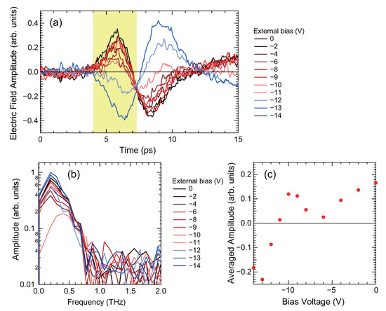 (a) Waveforms and (b) FFT amplitude of the THz radiation at various bias voltages from 0 to −14 V and (c) THz radiation amplitude averaged over the first peak period, shown in the yellow rectangle in (a).