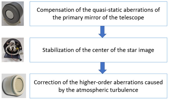 This paper discusses a system for active laser beam stabilization based on an FPGA [11]. The system is a part of a closed-loop adaptive optical system to improve the efficiency of high-resolution spectroscopy on the 6 m telescope BTA [12]. The structure of the overall adaptive system for the telescope is presented in Figure 1. Each part is used for a certain purpose: some mirrors serve to compensate for large-scale slowly changing aberrations, while other mirrors compensate for small-scale aberrations that occur when passing through a turbulent atmosphere, and some mirrors are used to stabilize the position of the beam. We expect the whole adaptive system to decrease a star image on the spectrograph slit from 1 arcsec to 0.2 arcsec.