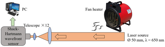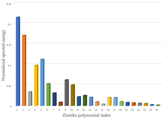To analyze the input of the atmospheric turbulence, we used a setup based on a self-made Shack–Hartmann wavefront sensor [14,15,16,17,18]. A laser beam wavefront is distorted by the airflow made by a 1.5 kW fan heater with a diameter of 200 mm. The aberrations caused by the fan heater are then analyzed with a high-speed Shack–Hartmann wavefront sensor (Figure 2) [19]. The image resolution is 480 × 480, and the microlenses array has 20 × 20 lenses with a focal length of 12 mm and a size of 240 µ × 240 µ each. A laser diode (LDS-655-FP-1.5 by Laserscom) with a wavelength of 650 nm coupled to an optical fiber is collimated up to a diameter of 50 mm. The data is obtained with a frequency of 2000 Hz. To reconstruct the wavefront, a modal method is used [20,21]. More information on the experiment is presented in [13]. The spectral energy distribution over Zernike polynomials is presented in Figure 3. This picture confirms that not only the tilts have to be corrected but also that higher-order aberrations have sufficient input. Thus, the use of the tip-tilt correction system is only the first step, and higher-order adaptive optics should be used [22] when the tilts are compensated. The tilts (Zernike 1 and Zernike 2) have the largest amplitude among the distortions caused by the atmospheric turbulence [23].