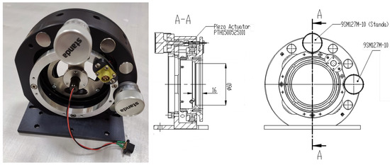 To stabilize the beam position, two tip-tilt mirrors controlled with an FPGA board were used. The tilts of the mirrors were ensured by piezoceramic elements with a capacity of 1 mF. The diameter of the mirror was 60 mm. The first resonance frequency of the mirror was found at 615 Hz. The mirror could be controlled with a frequency up to 500 Hz. The full dynamic range for the tilt correction was equal to 200 µrad, with a resolution of 0.05 µrad. A photo of the mirror and a cross-section together with the back view are shown in Figure 6. The piezoceramic elements (Ring Multilayer Piezo Actuators PTH1500525101 by Suzhou Pant Piezoelectric Tech. Co) were combined with the adjustment screws (9SM127M-10 by Standa).